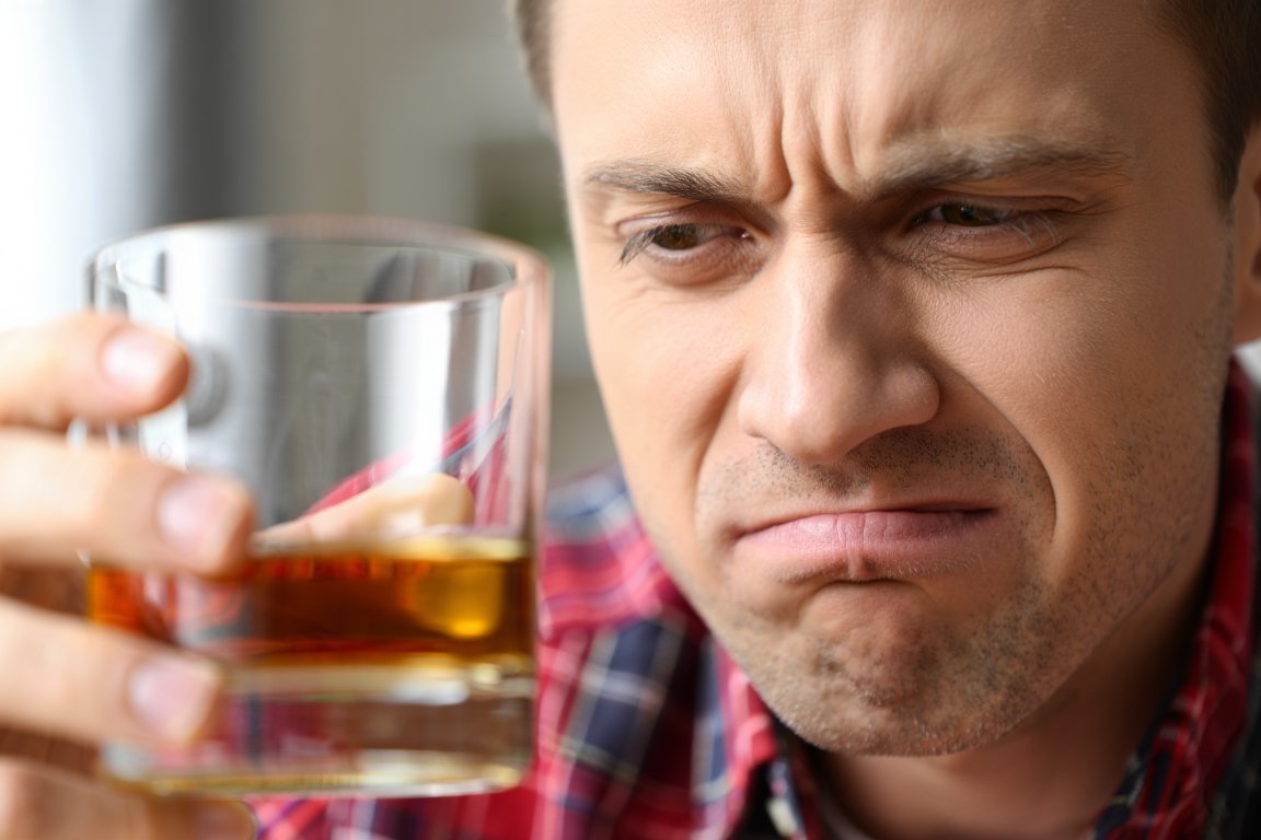Мужчина держит бокал и кривится на него